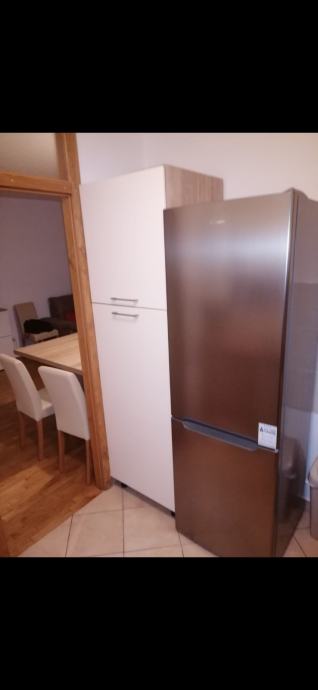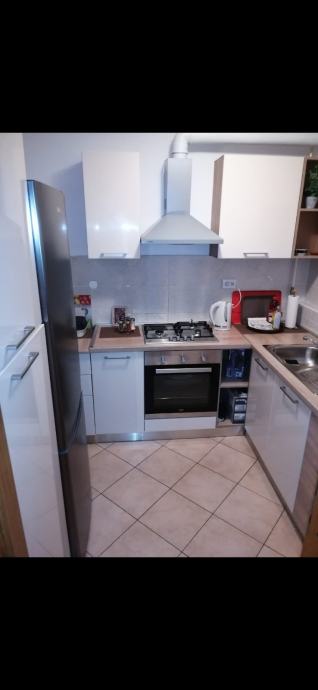 Stan je djelomično namješten - iz fotografija se vidi ulazni hodnik s ugrađenim ormarima, kuhinja opremljena hladnjakom i kuhinjskim elementima te blagovaonski dio sa stolom i stolicama. Grijanje je etažno plinsko centralno, a stan ima i klima uređaj. Energetski razred je B.