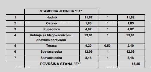 Stan E1, sastoji se od ulaznog hodnika, dnevnog boravka s kuhinjom i blagavaonom, 2 spavaće sobe, kupaone, ostave i terase.