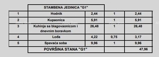 Stan G1, sastoji se od ulaznog hodnika, dnevnog boravka s kuhinjom i blagovaonom, spavaće sobe, kupaone i lođe.
