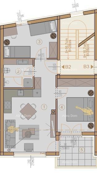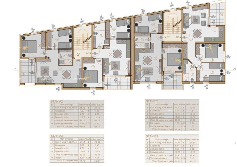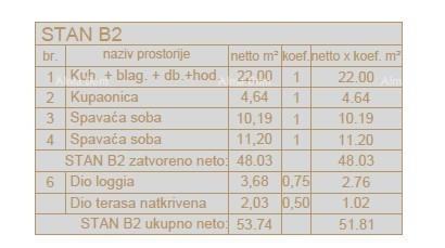 Stan B2, površine 53,74m2 (neto površine od 51.81m2) će se sastojati od kuhinje sa dnevnim boravkom i blagavaonom, 2 spavaće sobe, kupaone i dio loggie i terase.