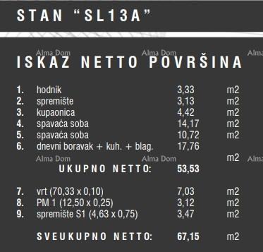 Stan oznake 13A, unutarnje površine 53.53m2, nalazi se u prizemlju zgrade i sastoji se od: hodnika, dnevnog boravka s kuhinjom i blagovaonom, 2 spavaće sobe, kupaone, spremišta i vrta.