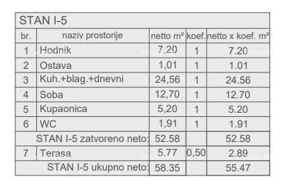 Stan I-5, nalazi se na 1. katu zgrade, ukupne kvadrature 58.35 m2 (netto 55.47 m2), a sastoji se od: hodnika, kuhinje, dnevnog boravka i blagovaonice, ostave, 1 spavaće sobe, kupaonice, wc-a i terase. Grijanje/hlađenje stana će biti osigurano uz klima uređaje Mitsubishi i podno grijanje.