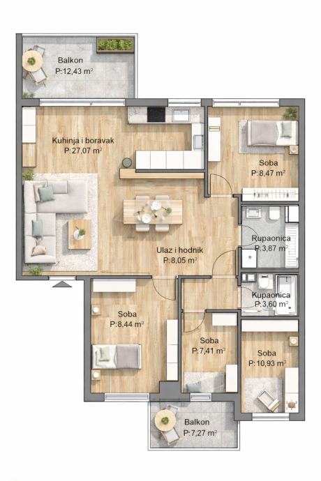 Moderan i funkcionalan četverosoban stan s odličnim rasporedom. Stan ima kuhinju s dnevnim boravkom, tri spavaće sobe, kupaonicu, ulazni hodnik i balkone. U cijenu su uključeni spremište i parkirno mjesto.