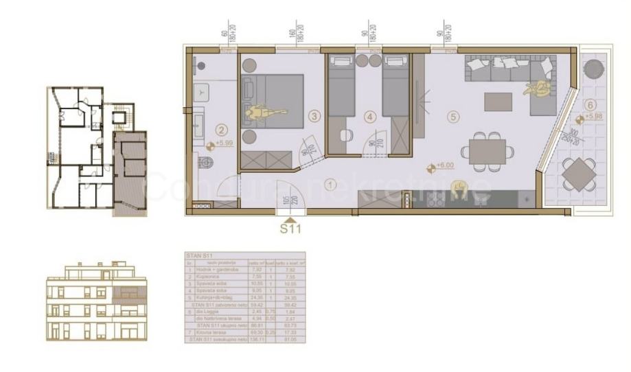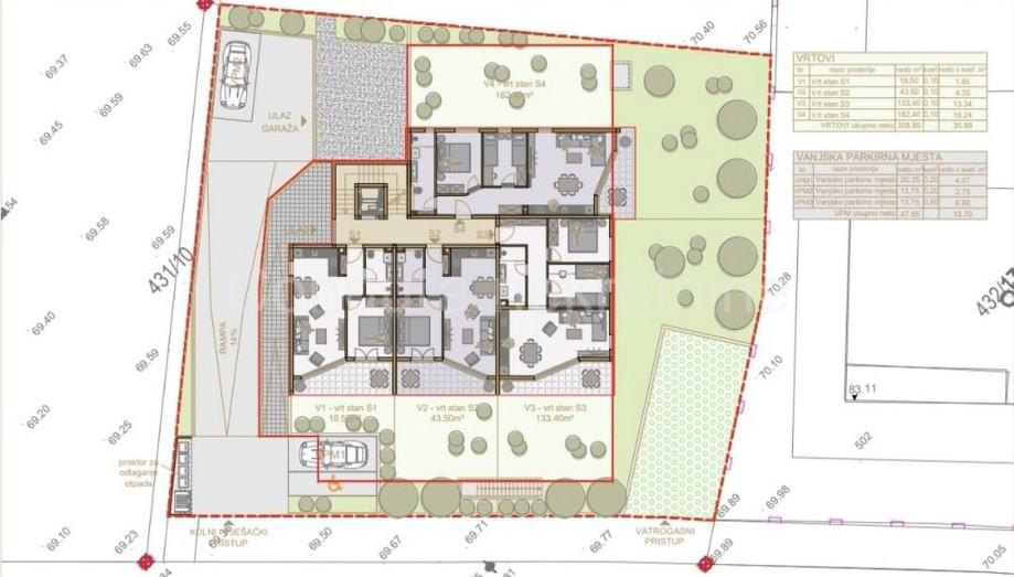 Predstavljamo moderan stambeni projekt koji obuhvaća ukupno 11 stanova vrhunske kvalitete. Zgrada se sastoji od 4 stana u prizemlju s pripadajućim vrtovima, 4 stana na prvom katu te 3 stana na drugom katu s prostranim krovnim terasama. U podrumu se nalaze 15 garažnih parkirnih mjesta i 11 spremišta, dok su ispred zgrade osigurana 3 vanjska parkirna mjesta.