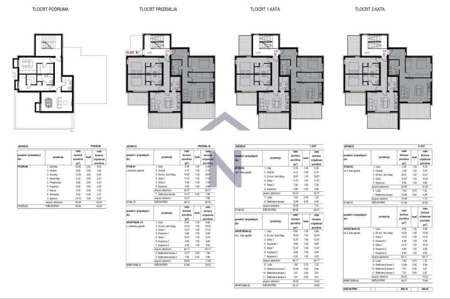 Na prvom katu je apartman oznake S2 ukupne neto stambene površine 52,37m2 te se sastoji od: ulaza, dnevnog boravka s kuhinjom i blagavaonicom, 2 spavaće sobe i kupaonice.