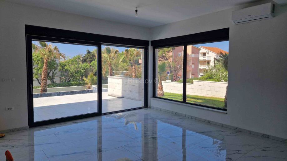 Velike staklene stijene zatvaraju dnevni boravak prema terasi i bazenu, pa se iz dnevnog boravka pruža pogled preko bazena na more. Sa svih etaža prostire se pogled na prekrasno plavo more. Kuća je opremljena visoko kvalitetnom opremom.