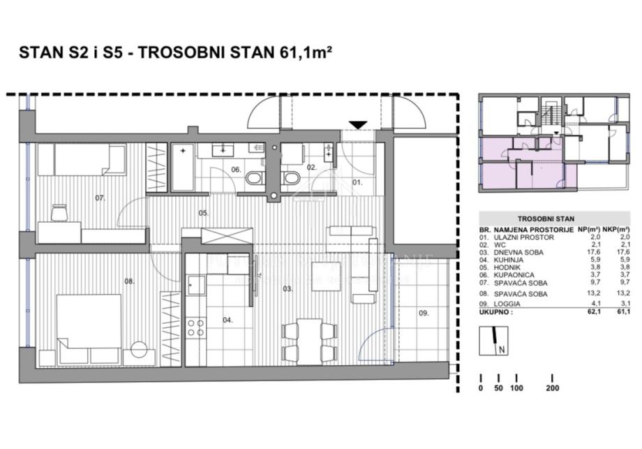 U mirnoj i urbanoj zoni zagrebačkog Stenjevca, u izuzetno atraktivnom kvartu koji spaja udobnost obiteljskog života s praktičnošću gradskog ritma, u tijeku je izgradnja moderne stambene zgrade s ukupno osam stanova – projekt osmišljen za one koji traže kvalitetan dom ili sigurnu investiciju. U ponudi je trosobni stan ukupne površine 61 m² koji savršeno kombinira funkcionalan raspored s udobnošću svakodnevnog života. Sastoji se od ulaznog hodnika, zasebnog WC-a, prostranog dnevnog boravka povezanog s kuhinjom i blagovaonicom, kupaonice, dvije udobne spavaće sobe te loggie koja pruža dodatni kutak za opuštanje.