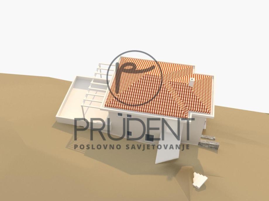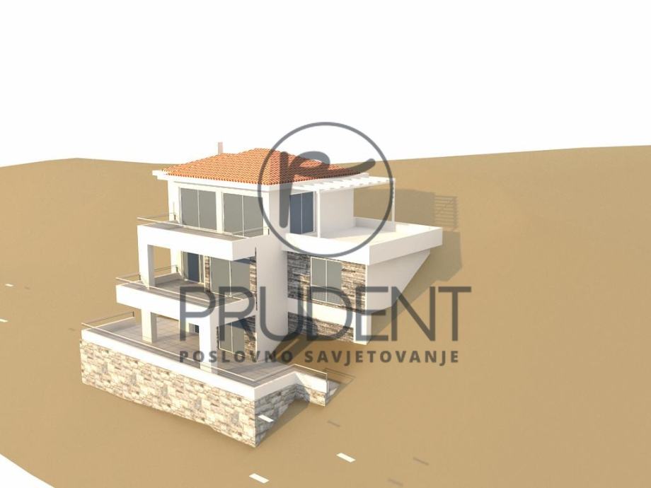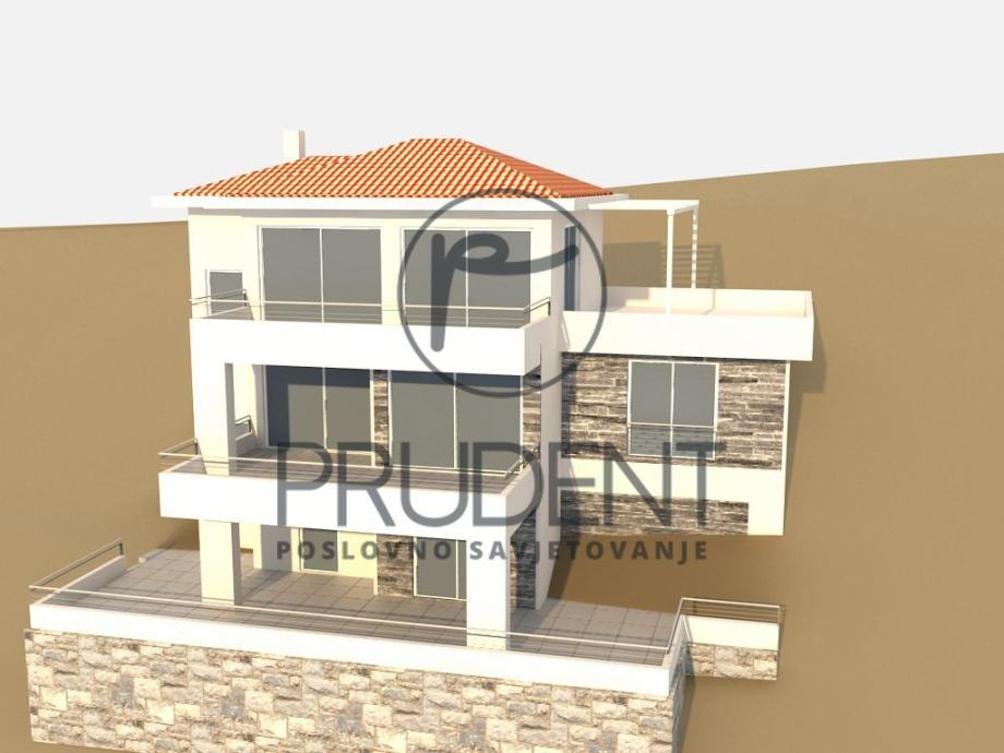 Građevina je namjenjena za stanovanje s jednom stambenom jedinicom. Sastoji se od tri nadzemne etaže (P+2) Prizemlje se sastoji natkrivene terase, konobe, kupaonice i stubišta. I kat se sastoji kuhinje/blagovaonice i dnevnog boravka, terase, stubišta s predprostorom, predsoblja/garderobe, kupaonice, wc-a i spavaonice. II kat se sastoji od tri spavaonice, predsoblja i kupaonice, dvije terase, stubišta i predprostora. Ulaz u objekt se nalazi na drugom katu i u tu svrhu je potrebno iugraditi ulaznu rampu kao i stubište položeno na teren, a to sve zbog vrlo strmog terena. Građevina je od susjednih parcela udaljena min 3 m, a od pristupnog puta 5 m. Nepravilnog je oblika, prilagođena obliku parcele pa maximalni gabariti iznose 14,42*11.14 m. Na parceli su predviđena dva parkirna mjesta.