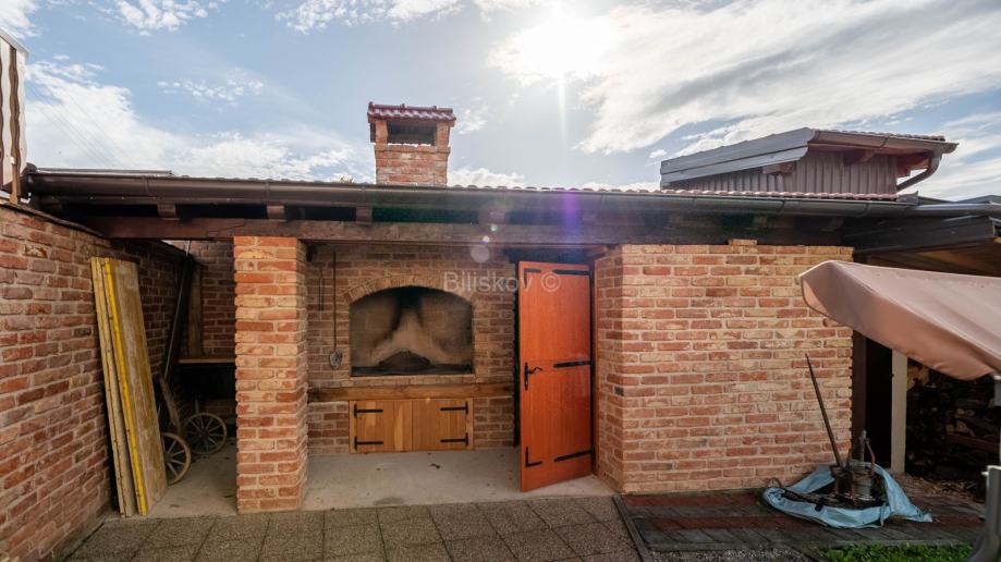 Sa stražnje strane kuće se nalazi spremište, pušnica i veliki kamin.