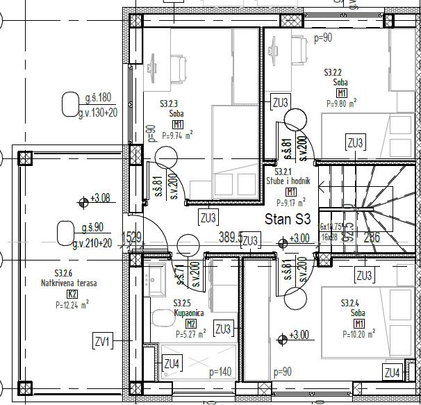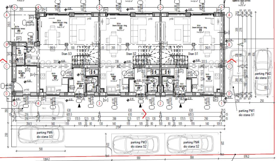 S3: 99,23 m2 + 90,06 m2 dvorište + 2 parkirna mjesta (ukupne površine 25 m2)