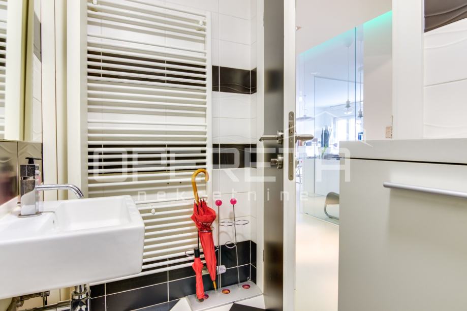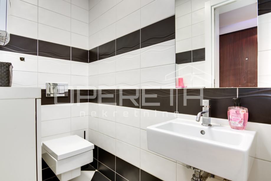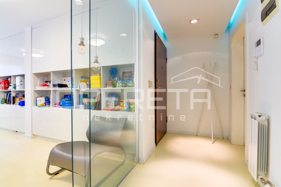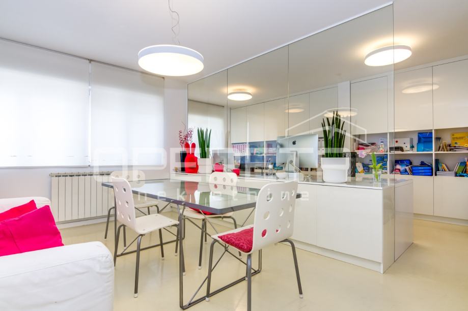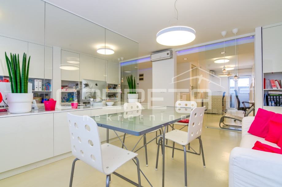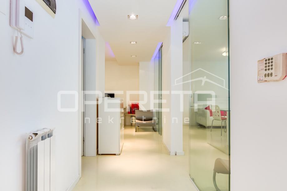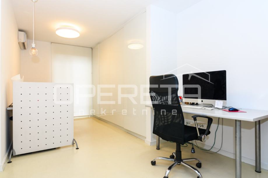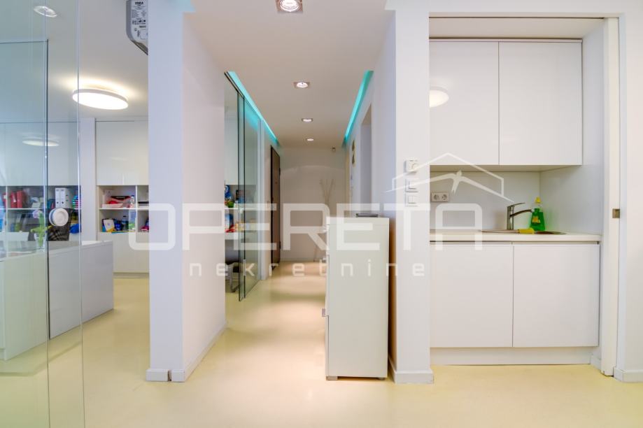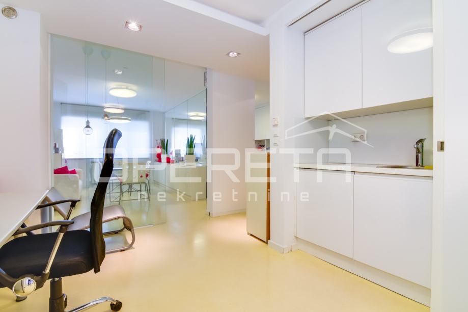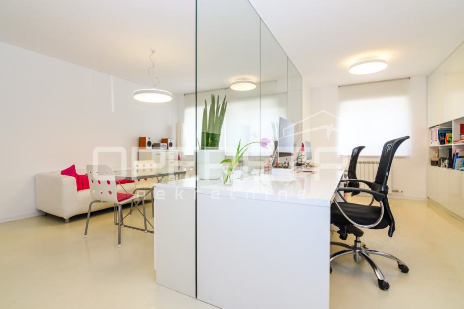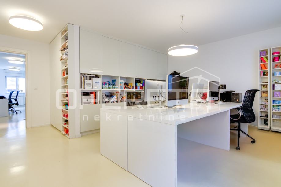 Prostor uređen je sa epoxy podovima, staklenim pregradnim stijenama te kvalitetnim uredskim namještajem izrađenom prema narudžbi . Idealan je za uredsko poslovanje, dizajnerski, arhitektonski studio i dr.