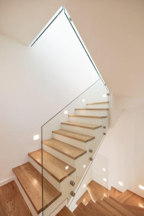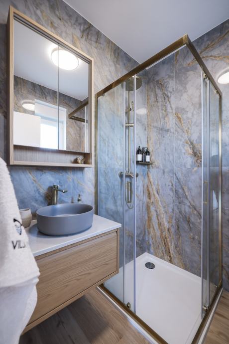 Bjelin seljački pod hrast parket, prvoklasna keramika, Danfoss podno grijanje u cijeloj kući, klima u svim prostorijama, protuprovalna vrata, PVC sa 3-slojnim staklom, termo fasada, A energetski razred