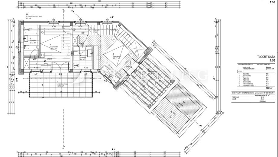 Vila se sastoji od prizemlja veličine 92 m2 i kata veličine 80 m2.