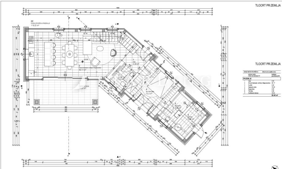 Prizemlje se sastoji od: dnevnog boravka s kuhinjom i blagovaonom, spavaćom sobom, wc-om, kupaonom, tehničkom sobom i natkrivenom terasom te bazenom veličine 32 m2.