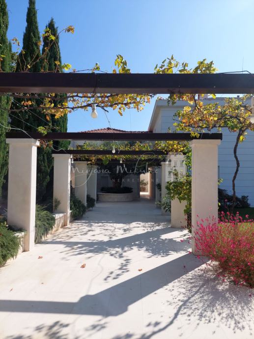 Koncipirana je tako da sa ulične strane se vidi samo gornji dio kuće. Sa ulice se ulazi u 2 garaže i poseban ulaz u kuću. Kuća na zadnjoj etaži ima odvojeni stan kojeg čine: hodnik, kuhinja, 2 kupaonice, 2 spavaće sobe, garderoba, dnevni boravak i izlaz na lođu i terasu ( cca 47 m2). Prizemlje čini: hodnik, kupaonica, kuhinja ( 22m2), blagovaonica ( 22.22 m2), dnevni boravak sa barom ( 56 m2) i izlaz na terasu od cca 35 m2. Donja etaža: vinoteka sa spremištem, kupaonica, vešeraj, 3 spavaće sobe i 2 kupaonice te pretprostor koji vodi prema bazenu. Uz bazen se prostire velika terasa te prostorije: sauna, teretana i dnevni boravak sa kuhinjom. Cijela kuća je iznutra povezana stubištem i liftom. Ova zbilja posebna nekretnina odiše luksuzom i ono što je najbitnije daje potpunu privatnost.
