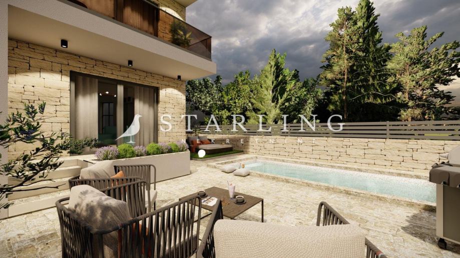 Iz dnevnog boravka se ulazi na natkriveni dio terase koji se nastavlja na vanjski bazen. Rub bazena popločan je kamenom, a unutrašnjost bazena popločana je mozaik pločicama. Sunčalište oko bazena obloženo je kamenom.