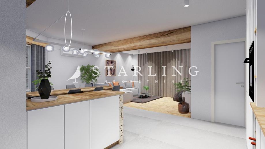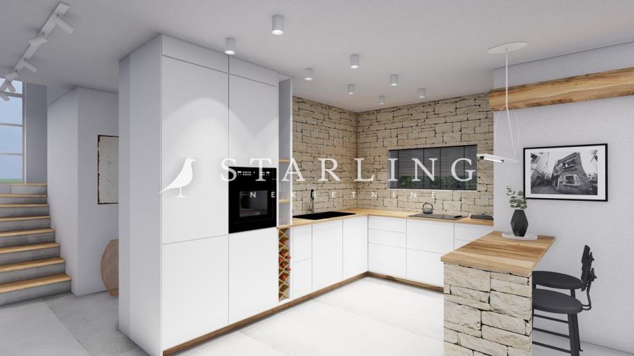 Prizemlje se sastoji od otvorenog dnevnog boravka s kuhinjom i blagovaonicom, spavaćom sobom i gostinjskom kupaonicom.