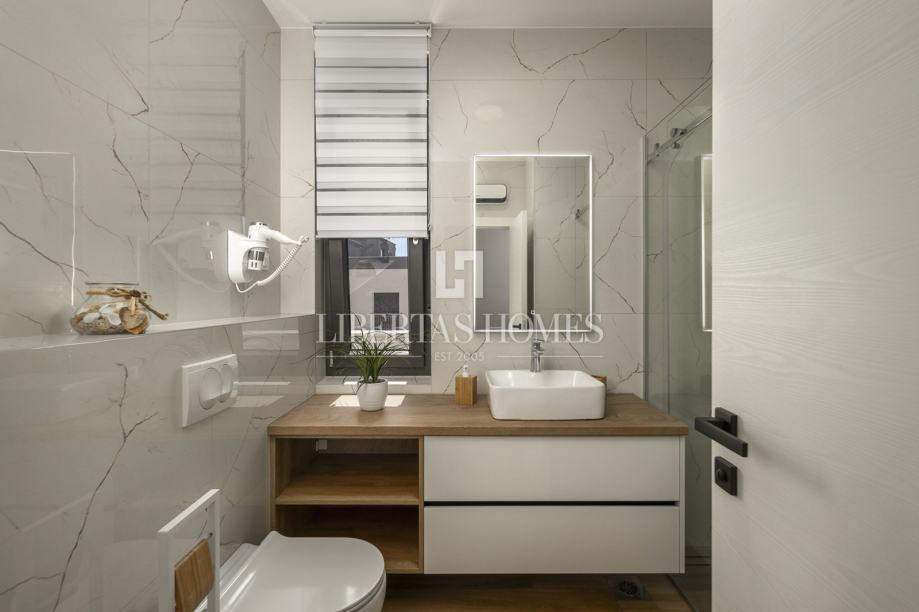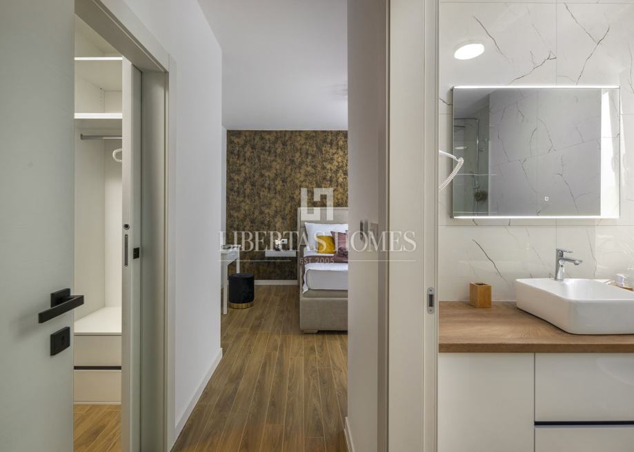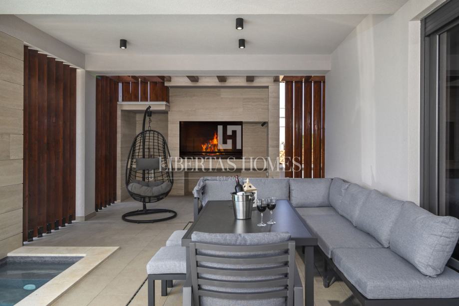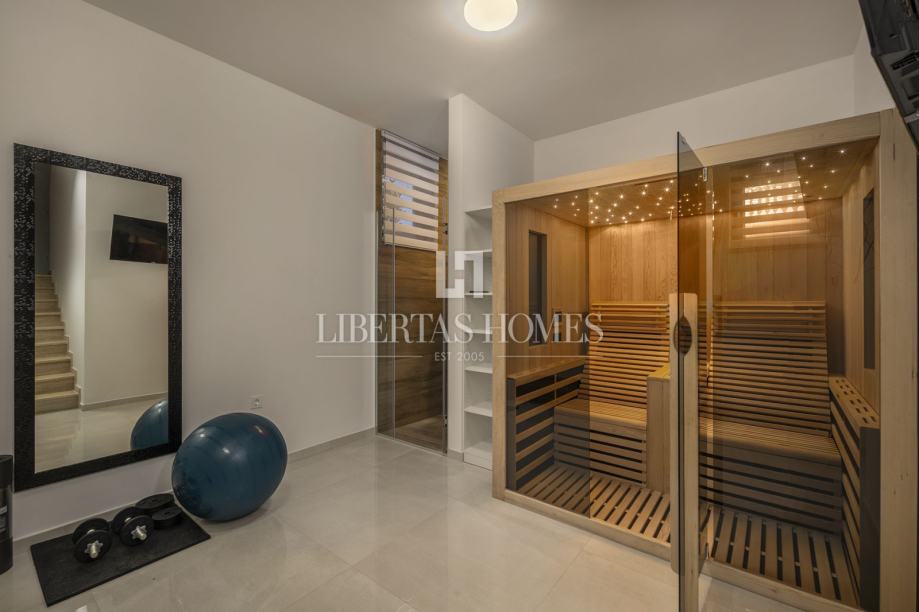 Prostrani dnevni boravak otvorenog koncepta u prizemlju povezan je s potpuno opremljenom kuhinjom i blagovaonicom, a klizne stijene vode do natkrivene terase, idealne za opuštanje i druženje. Na prvom katu nalaze se tri elegantno uređene spavaće sobe, svaka s vlastitom kupaonicom i izlazom na balkone, osiguravajući maksimalnu udobnost i privatnost. Podrum je zamišljen kao osobna wellness oaza s luksuznom saunom i moderno opremljenom teretanom, dok se na vrhu vile nalazi prostrana krovna terasa s pogledom na more i okolinu.