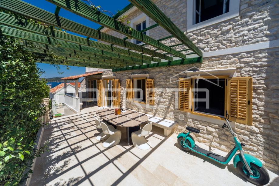 U neposrednoj blizini mora, na Visu, iz naše ponude izvadajamo posjed sa dvije luksuzne kuće sa bazenom. Prva kuća, tlocrtne površine 112 m2 sastoji se od prizemlja i kata. Prizemlje se sastoji od potpuno opremljene kuhinje s povezanim prostranim dnevnim boravkom. Na katu su smještene dvije glavne spavaće sobe s povezanim kupaonicama. Druga kuća, tlocrtne površine od 64 m2 sastoji se od kuhinje s povezanim dnevnim boravkom. Iza dnevnog boravka nalazi se spavaća soba s kupaonicom i malim privatnim vrtom. Na katu su smještene dvije spavaće sobe s vlastitom kupaonicom. Glavna spavaća soba ima tereasu s prekrasnim pogledom na cijeli zaljev. Uz kuću se nalazi i ostava sa sobom za vešeraj. U dvorištu se nalazi bazen, vanjska kuhinja i tradicionalna peć za peku ili roštiljanje. Uz bazen se nalaze još dvije sobe s vlastitim kupaonicama. Više informacija dostupno je na upit.