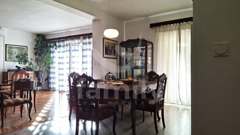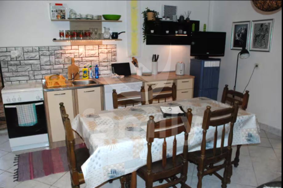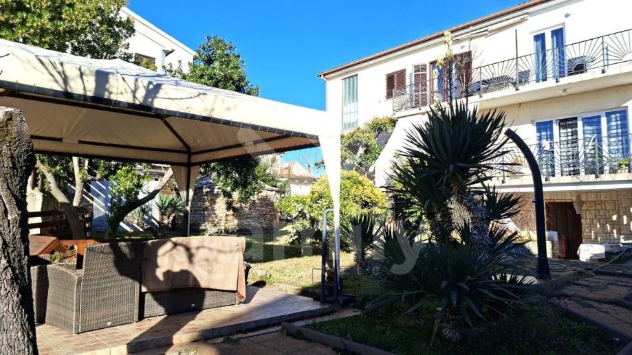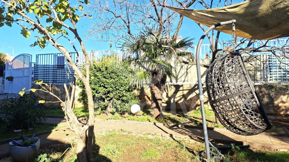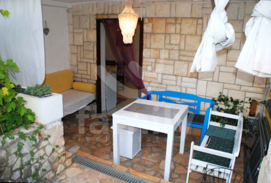 Na prvome katu su dva kompletno opremljena apartmana sa tri spavaće sobe i izlazom na prostranu terasu sa pogledom na more te je postavljena drvena stolarija, podovi su obloženi keramikom te je sustav grijanja i hlađenja na katu reguliran putem 3 jedinice klima uređaja. Ova interesantna nekretnina nudi jako veliki potencijal zbog svoje komotnosti kao i širine dvorišta dvorišta gdje je zasađeno razno citrusno voće kao i stabla masline. Ispred same kuće se nalaze šest parkirnih mjesta.