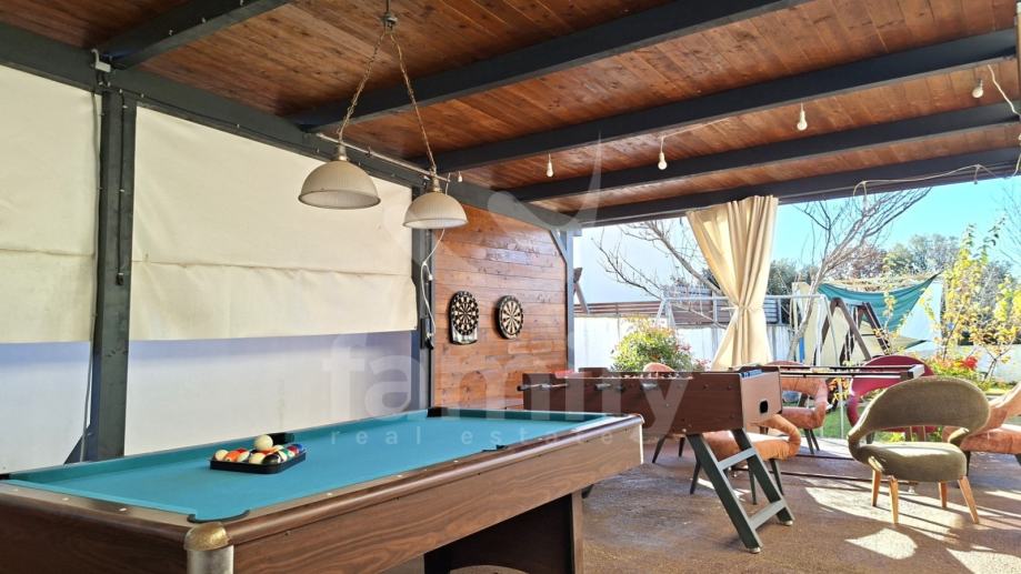 U mirnom okruženju u Barbarigi nalazi se obiteljska kuća stambene površine 420 m2 sa okućnicom od 1130 m2. Kuća visokog potencijala se sastoji od četiri stambene jedinice. U prizemlju kuće nalazi se prostrani osvijetljeni stan površine 120 m2 koji se sastoji od prekrasnog dnevnog boravka sa kuhinjom i blagovaonom, izlazom na komfornu terasu sa pogledom na dvorište te jednom spavaćom sobom sa zatvorenom terasom. Također u prizemlju se nalazi jedno kupatilo i zaseban toalet dok je u suterenu navedene nekretnine smješten jedan studio apartman. Stan u prizemlju je opremljen PVC stolarijom, podovi su obloženi pločicama i parketom, grijanje je regulirano putem kalijeve peći i klima uređaja. Nekretnina je bogata sadržajem visoko kvalitetnog te ručno rađenog namještaja i umjetninama kao što su slike, lampe, karniše za zavjese, rukohvati na stubištu kao i brojne komode koje su dostavljene iz Afrike i Egipta.