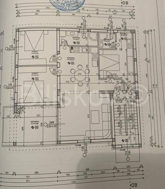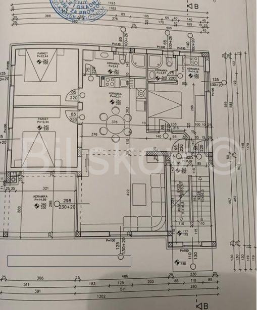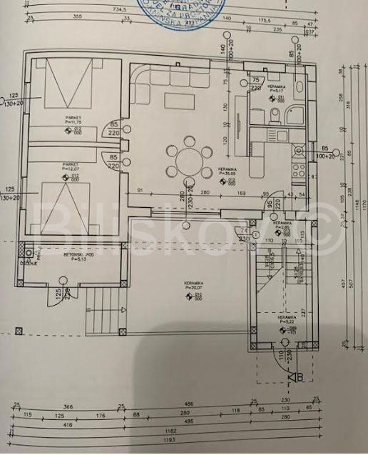 U prizemlju je trosobni stan od 78m2, a sastoji od: dnevnog boravka koji je integriran sa kuhinjom i blagovaonicom, 2 spavaće sobe, kupaonice i terase.