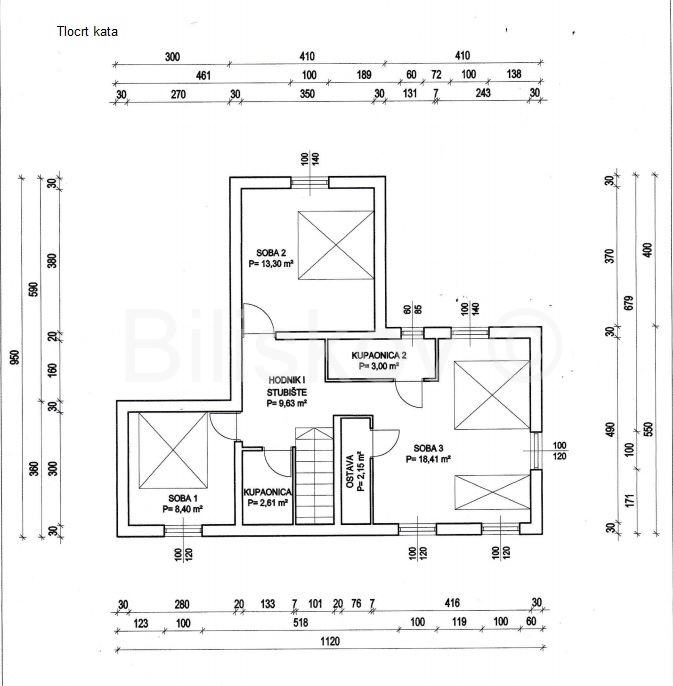 Na katu se nalaze tri spavaće sobe, dvije kupaonice i ostava.