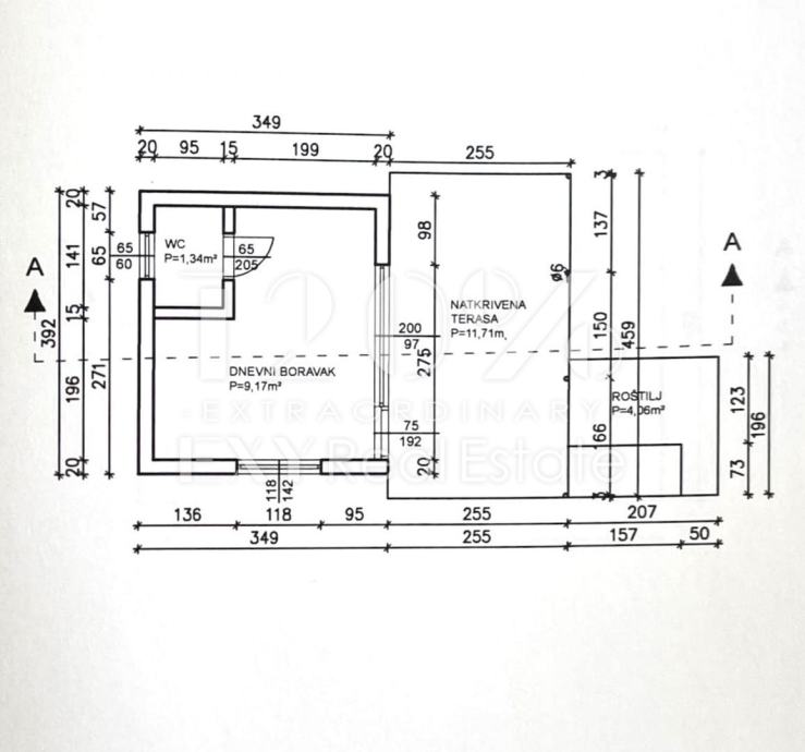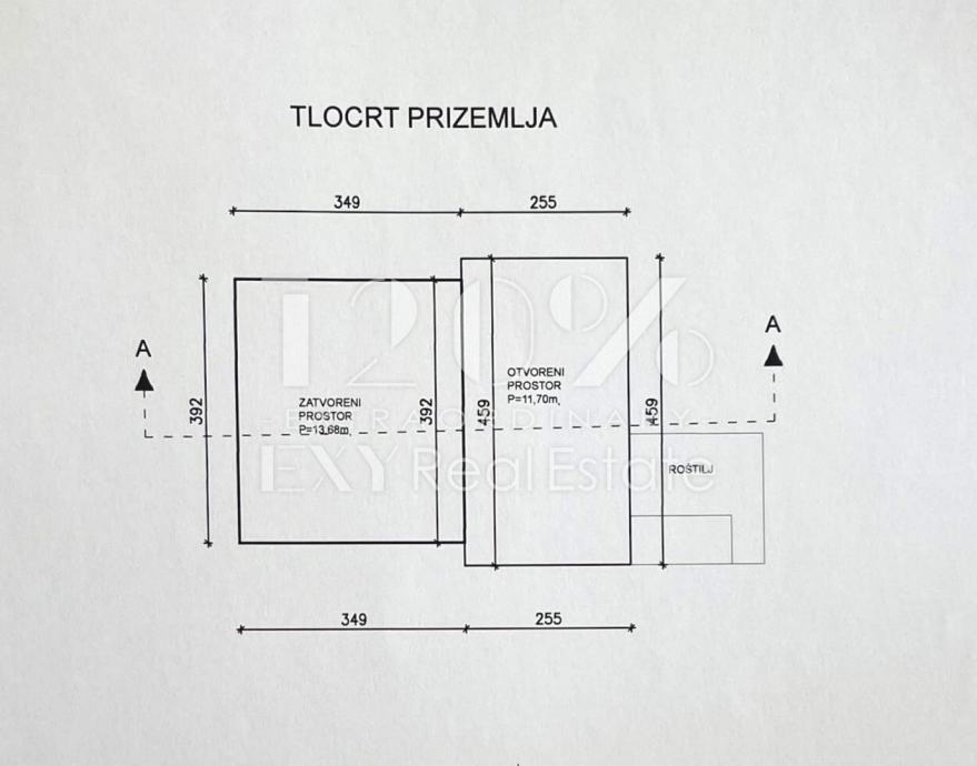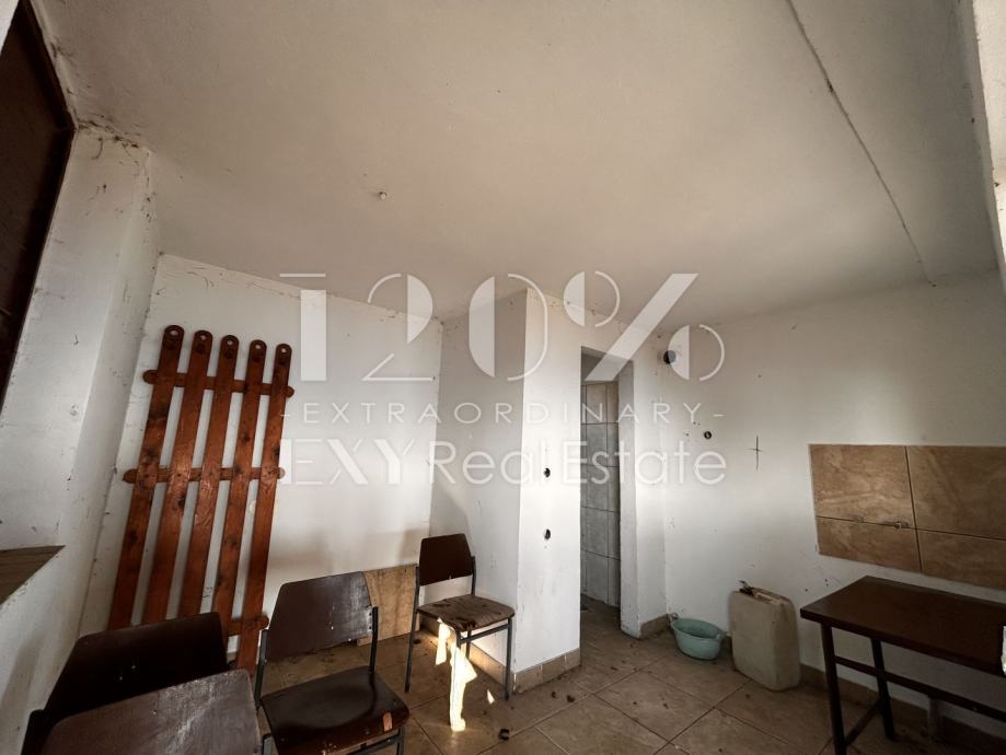 Kuća ima ukupnu površinu od 25,38 m², od čega je 13,68 m² zatvorenog prostora, dok preostalih 11,7 m² čini natkrivena terasa s betonskim kaminom, idealna za uživanje na otvorenom. Unutrašnjost kuće sastoji se od jedne prostorije i WC-a te je potrebno opremanje interijera prema vlastitim željama.
