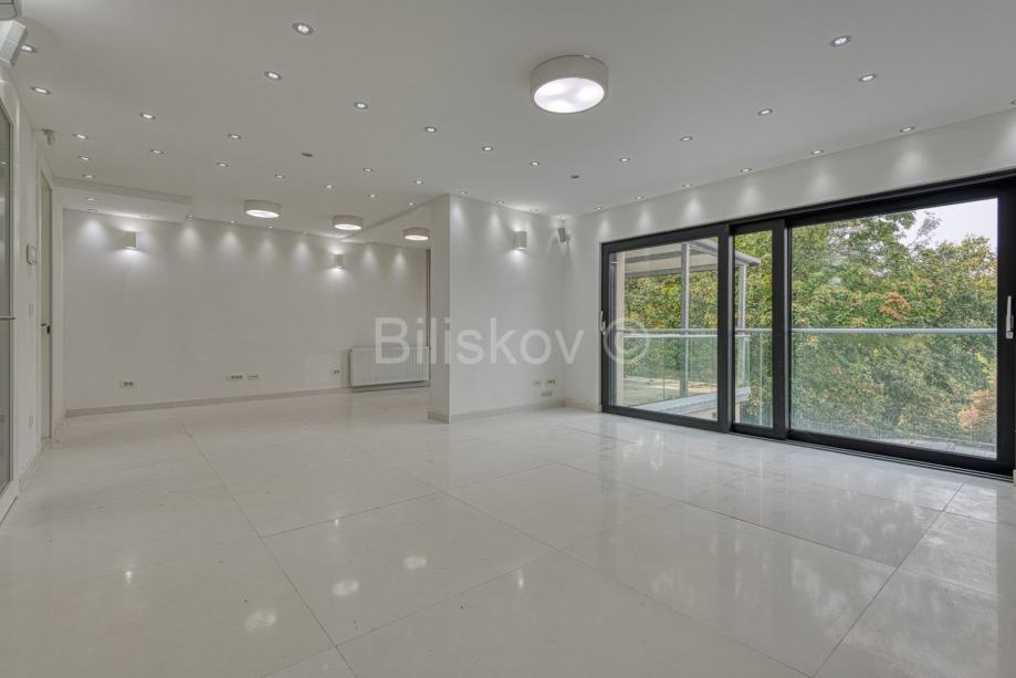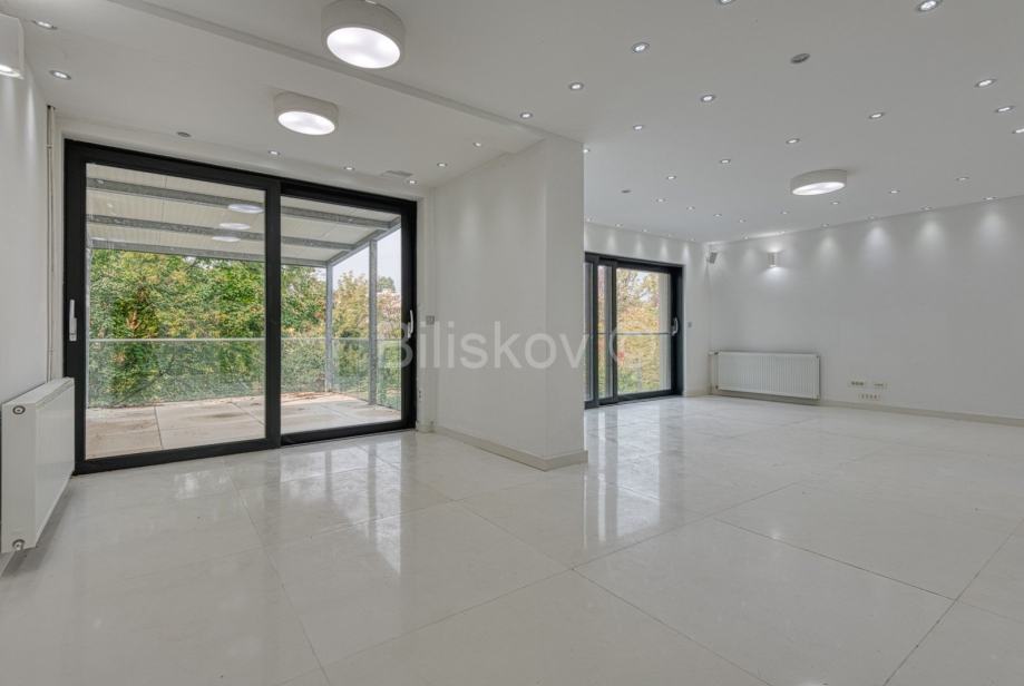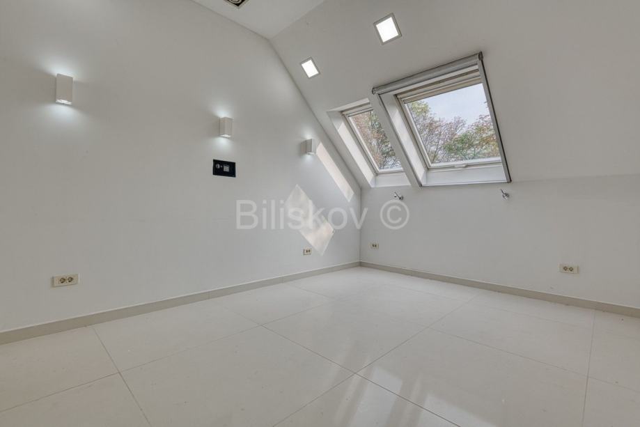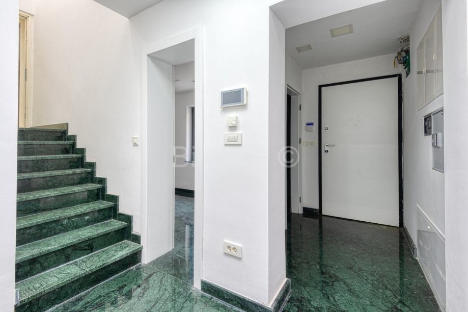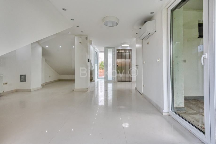 U prizemlju se nalazi dnevni boravak, toalet, predsoblje, i natkrivena terasa, na 1. katu se nalaze tri spavaće sobe, dvije kupaonice, i garderobe, na zadnjoj etaži se nalazi veliki dnevni boravak, kupaonica i natkrivena terasa s koje se pruža prekrasan pogled na Tuškanac i Dubravkin put.
