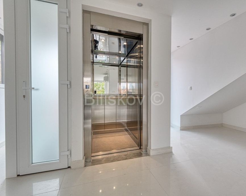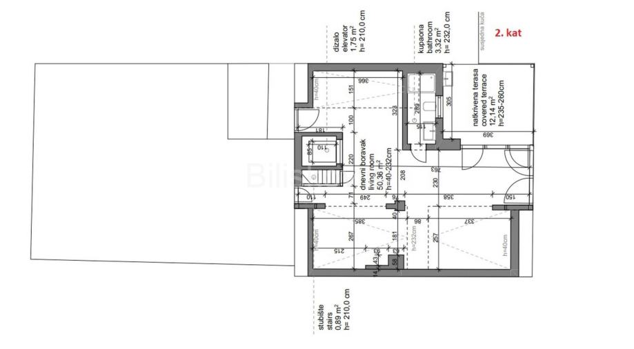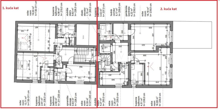 Drugi dio kuće se sastoji od suterena u kojem se nalazi kotlovnica, kupaonica, tehnička prostorija za baze, lift koji povezuje sve 4 etaže druge kuće.