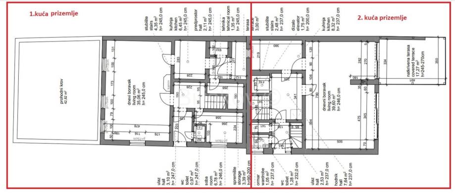 Kuća ima dva zasebna ulaza, i može funkcionirati kao dvije zasebne cjeline. U etaži 1.kata su međusobno povezane.