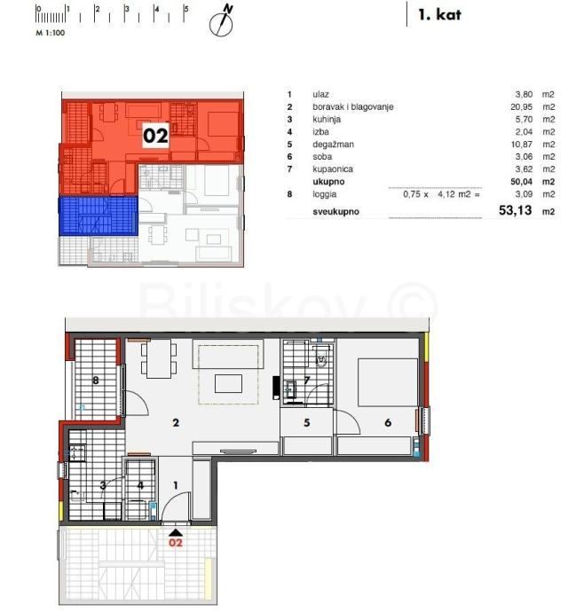 Funkcionalan dvosoban stan ukupne površine 53,13 m2 na prvom katu zgrade izgrađene 2024. godine.