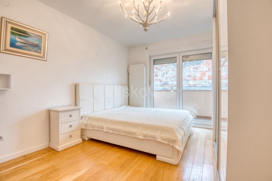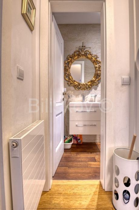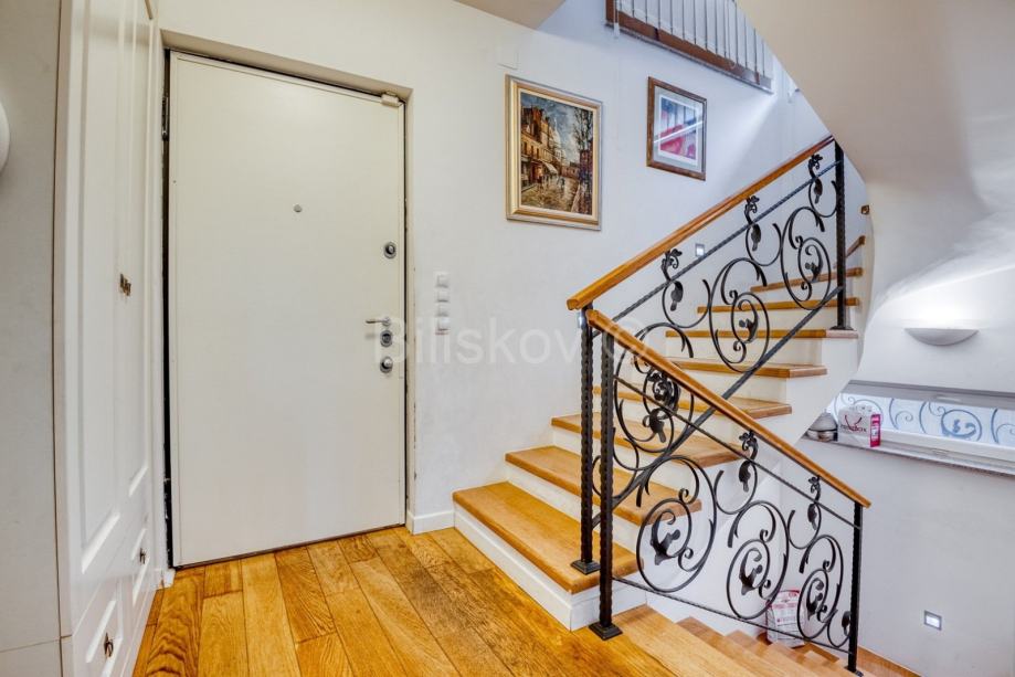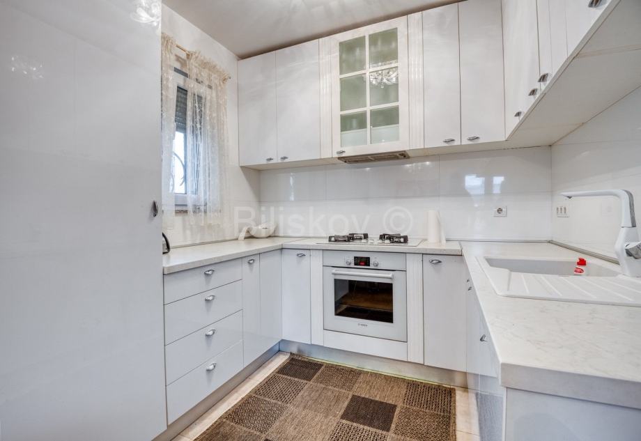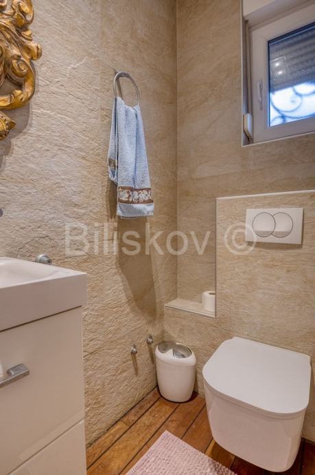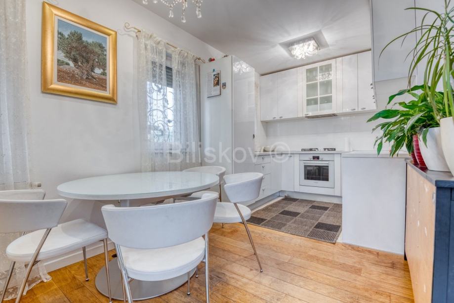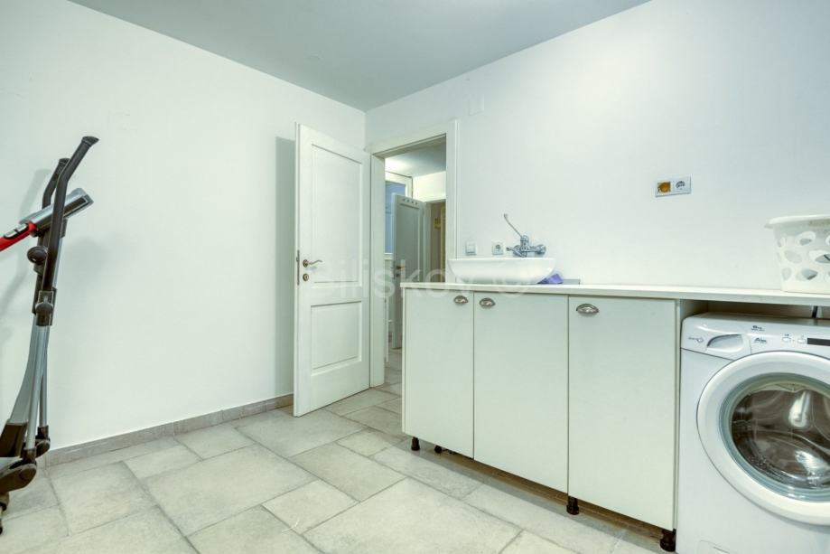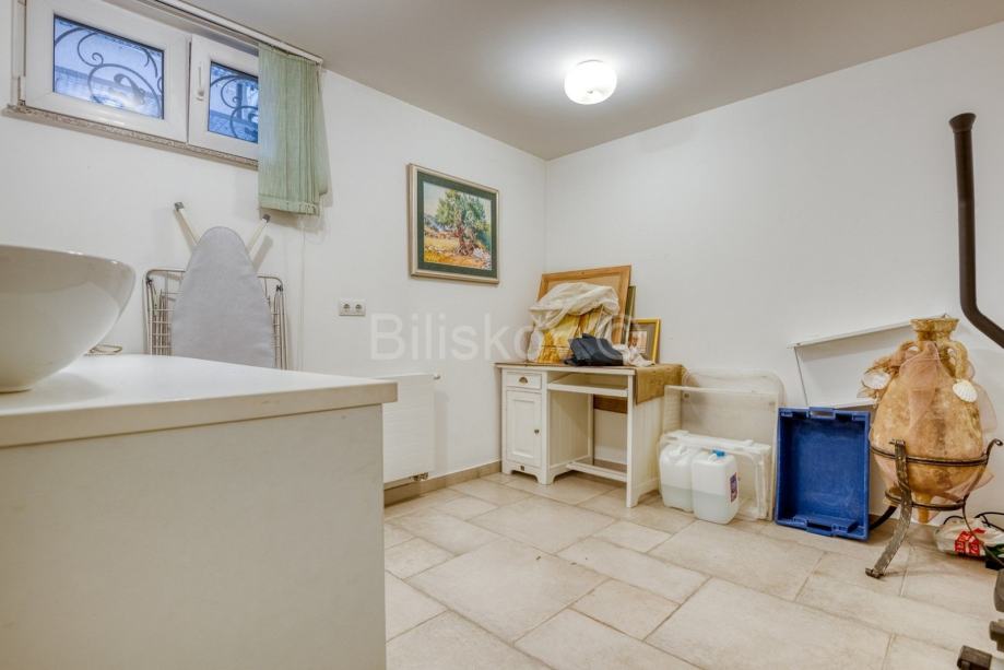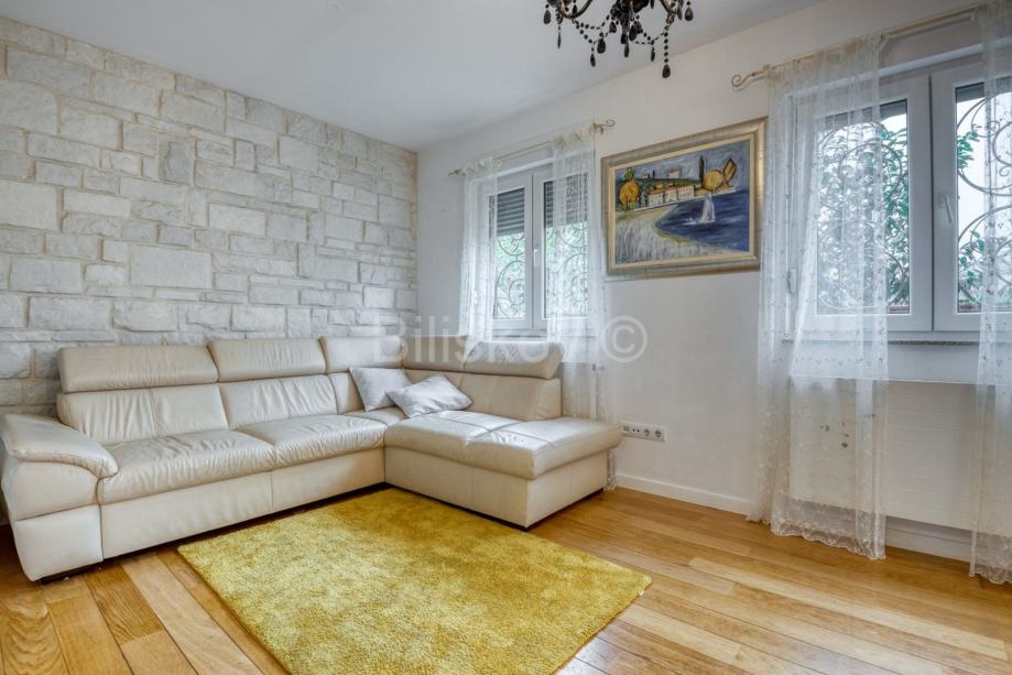 U prizemlju se nalazi veliki dnevni boravak, blagavaona , kuhinja i toalet. Iz dnevnoga boravka direktan je pristup dvorištu i velikom roštilju. Na katu se nalaze tri spavaće sobe, kupaona i terasa.