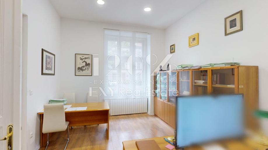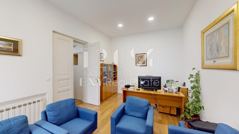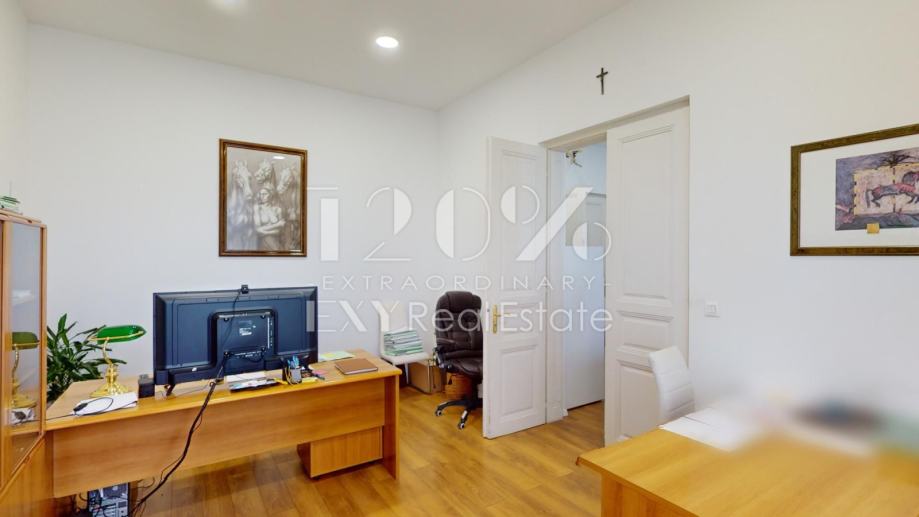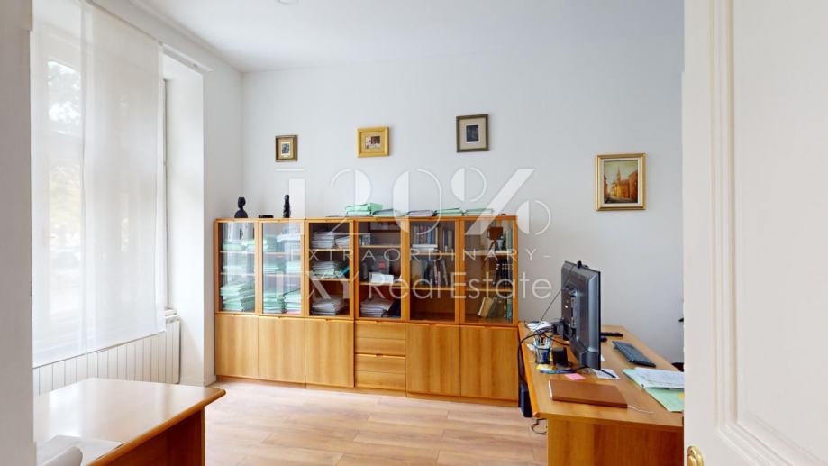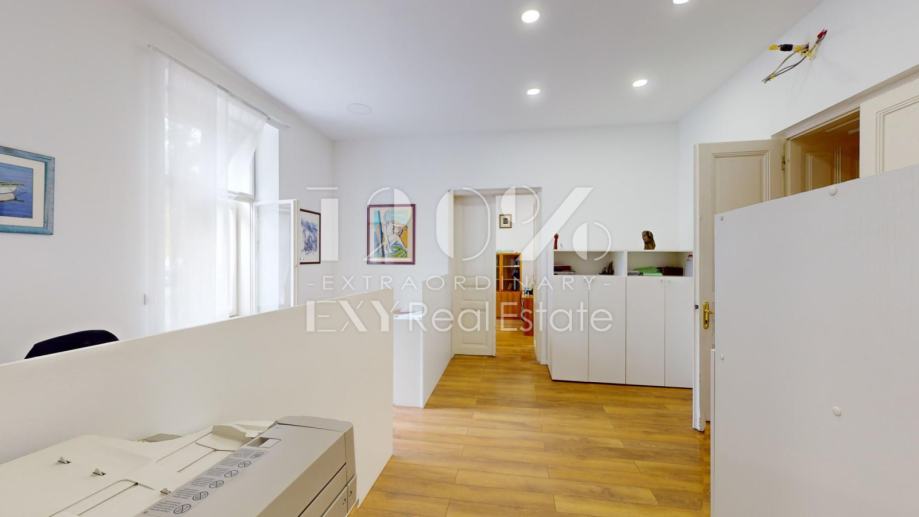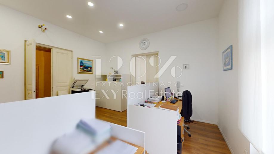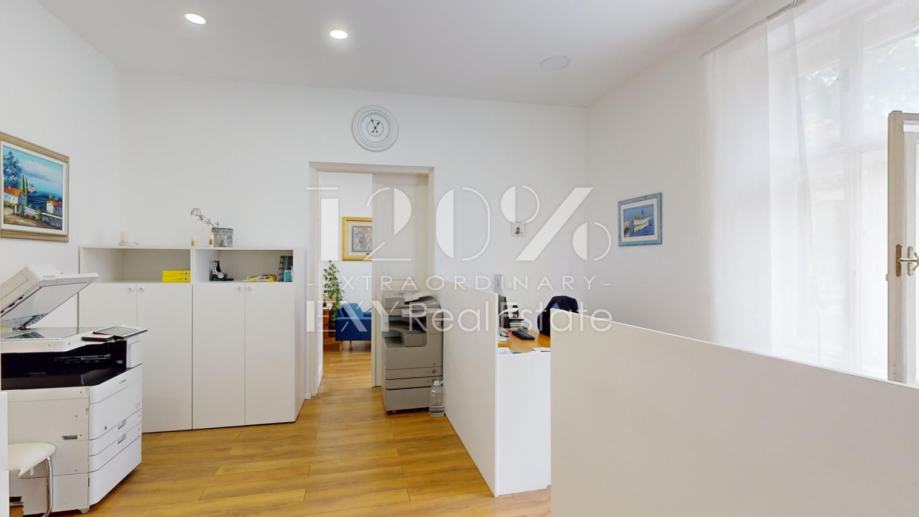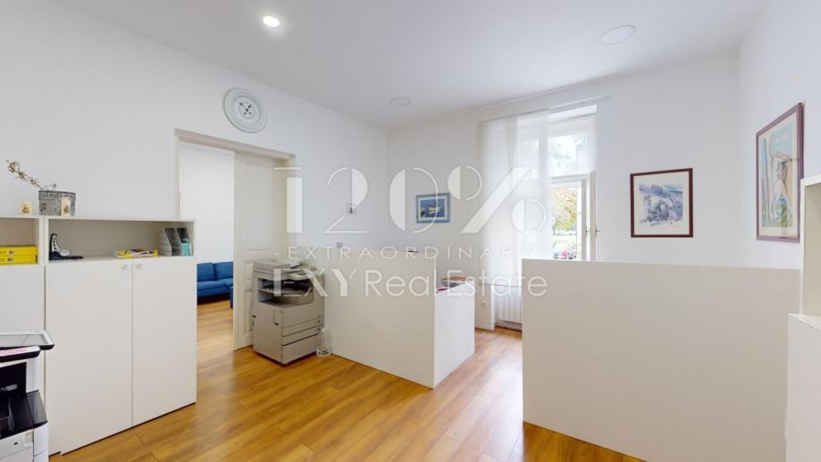 Stan je trenutno u funkciji ureda i sastoji se od ulaznog hodnika, pet odvojenih soba, kuhinje s blagovaonicom, WC-a i ostave unutar stana. Također, stanu pripada i spremište na istoj etaži površine otprilike 8 m². Trenutno je u funkciji ureda, što zahvaljujući svom funkcionalnom rasporedu pruža brojne mogućnosti. Tlocrt omogućuje fleksibilnost preuređenja, što je idealno za prilagodbu prostora prema vlastitim željama i potrebama.