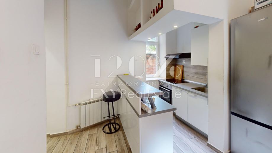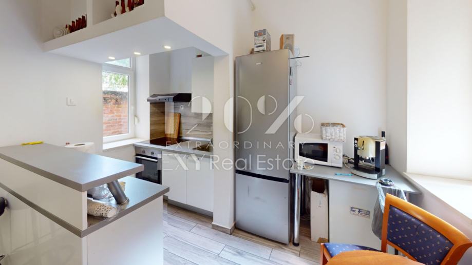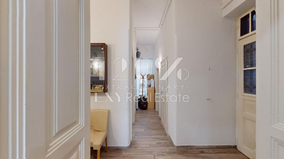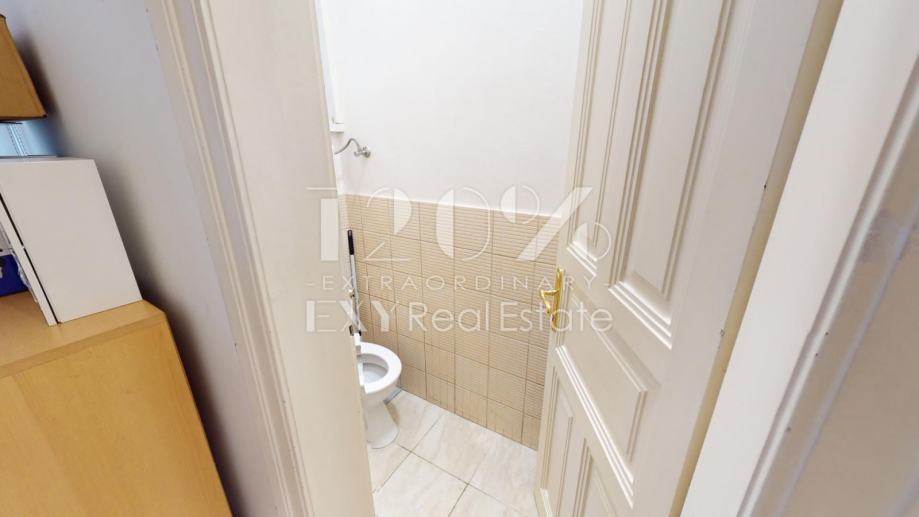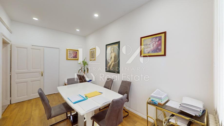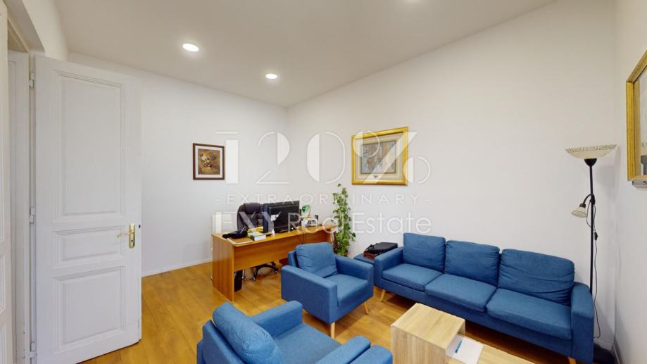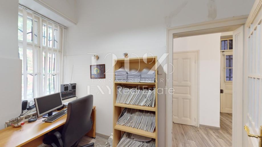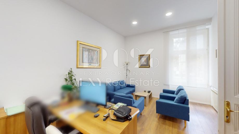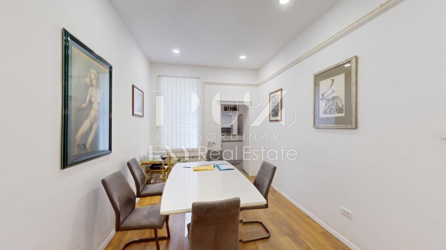 Stan je trenutno u funkciji ureda i sastoji se od ulaznog hodnika, pet odvojenih soba, kuhinje s blagovaonicom, WC-a i ostave unutar stana. Također, stanu pripada i spremište na istoj etaži površine otprilike 8 m². Trenutno je u funkciji ureda, što zahvaljujući svom funkcionalnom rasporedu pruža brojne mogućnosti. Tlocrt omogućuje fleksibilnost preuređenja, što je idealno za prilagodbu prostora prema vlastitim željama i potrebama.
