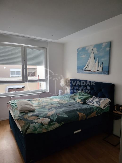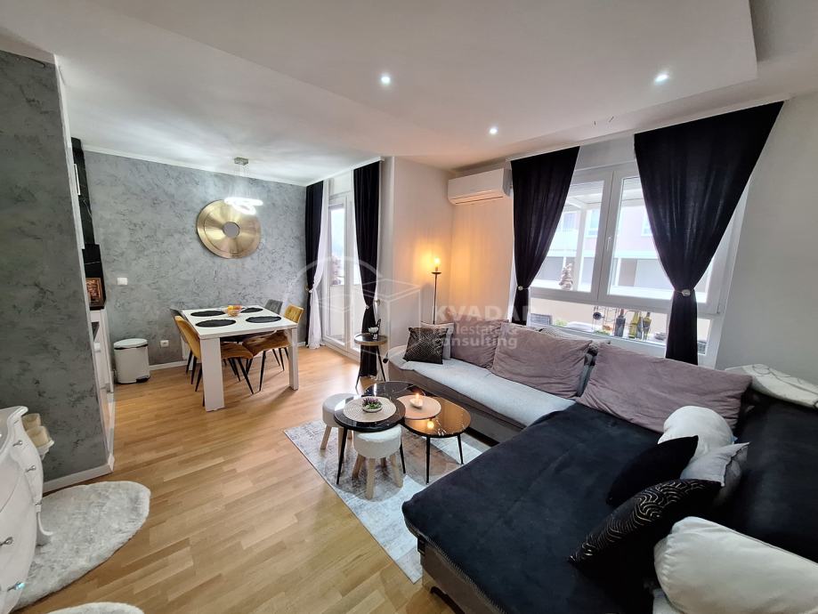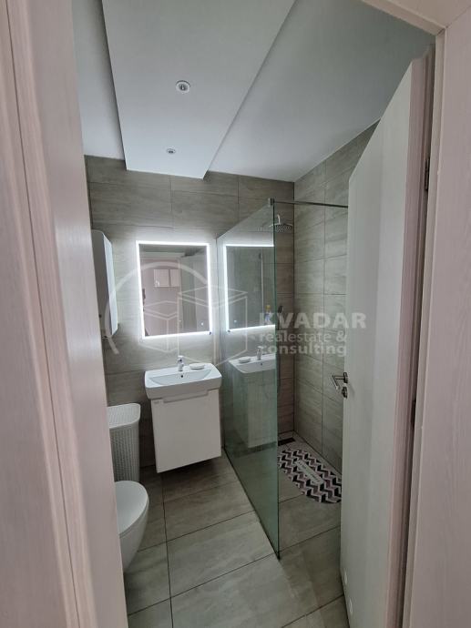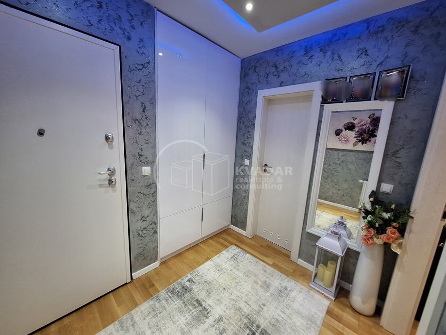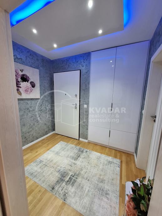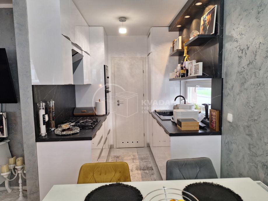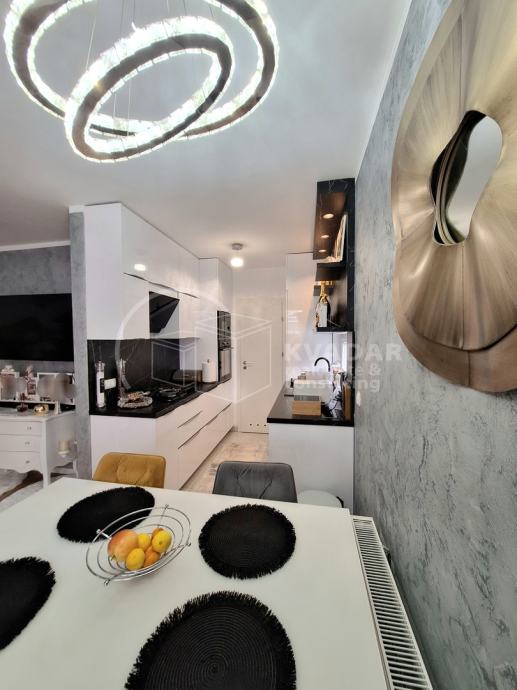 Potpuno opremljen novim namještajem, s kvalitetnom kuhinjom rađenom po mjeri, spušteni stropovi sa rasvjetom, walk in tuš, protuprovalna vrata, klimatiziran.