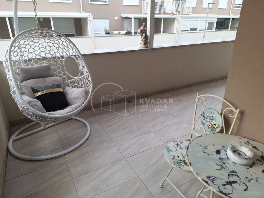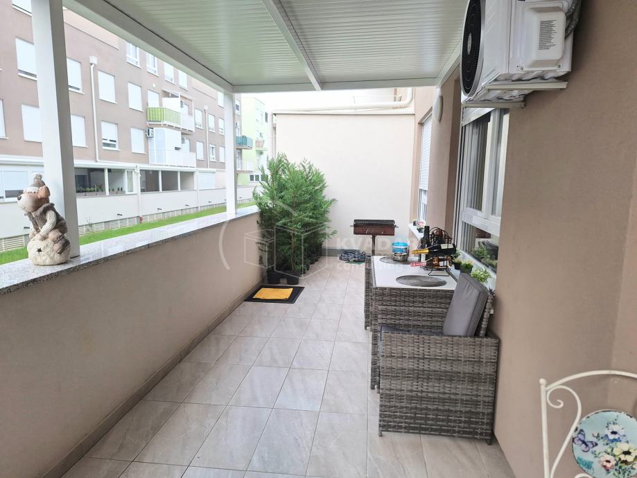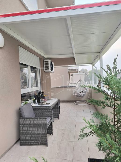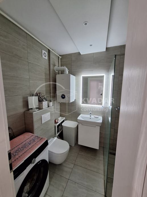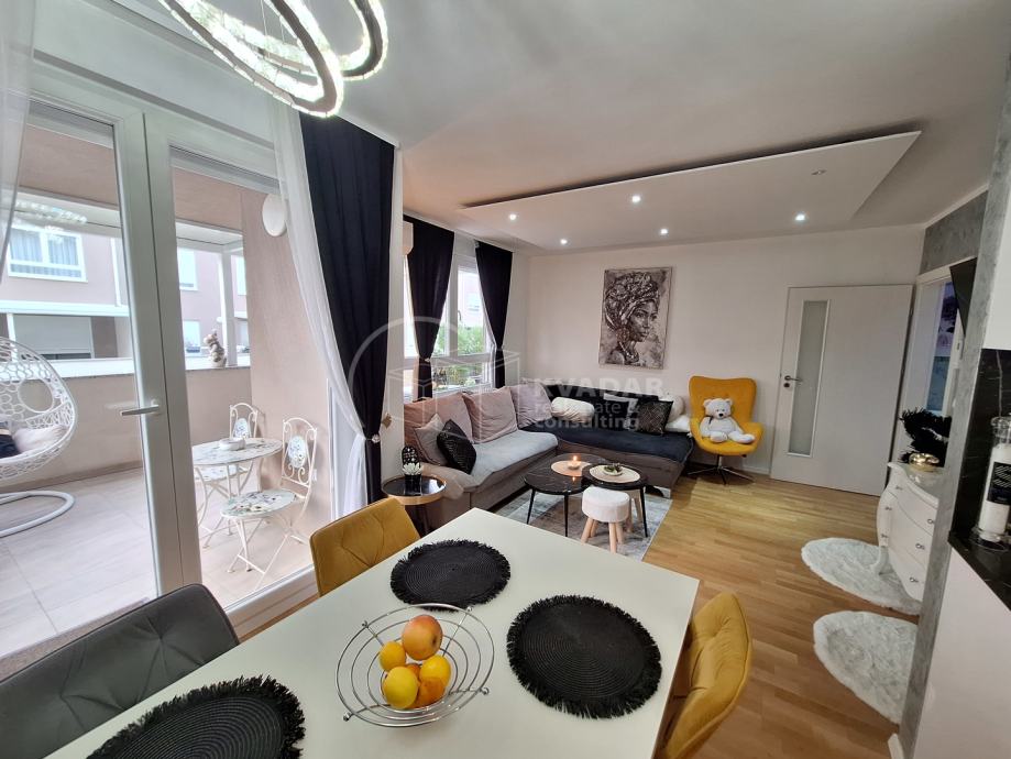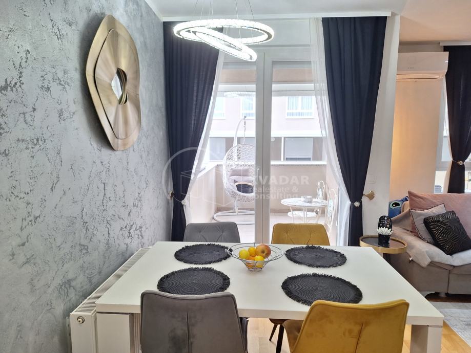 Potpuno opremljen novim namještajem, s kvalitetnom kuhinjom rađenom po mjeri, spušteni stropovi sa rasvjetom, walk in tuš, protuprovalna vrata, klimatiziran.