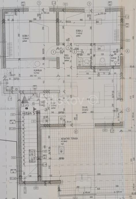 Stan ima 65, 80 m2 podne površine (zatvoreni prostor) + terasa (ukupno 40 m2).