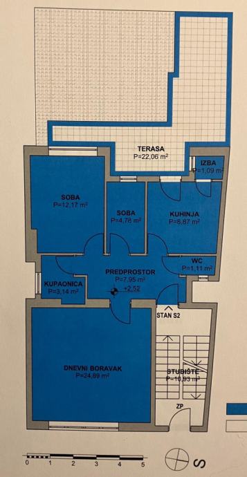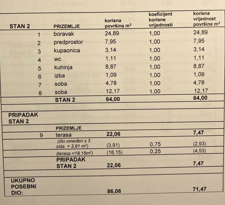 Stan se sastoji od predprostora, izbe, kuhinje, tri sobe, kupaonice i toaleta površine 64m2 te terase površine 22.06m2 (NKP 7.47m2).