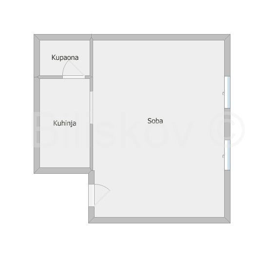 Stan se sastoji od kuhinje, kupaone i sobe. Prostor WC-a odijeljen je od stambenog prostora.