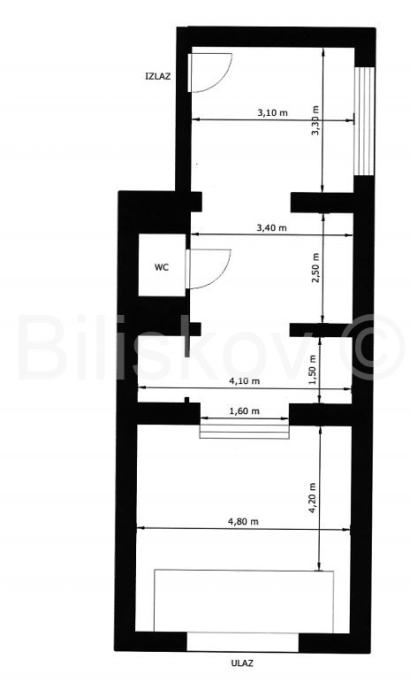 Sastoji se od tri prolazne prostorije, malog skladišta, garderobe i wc-a.