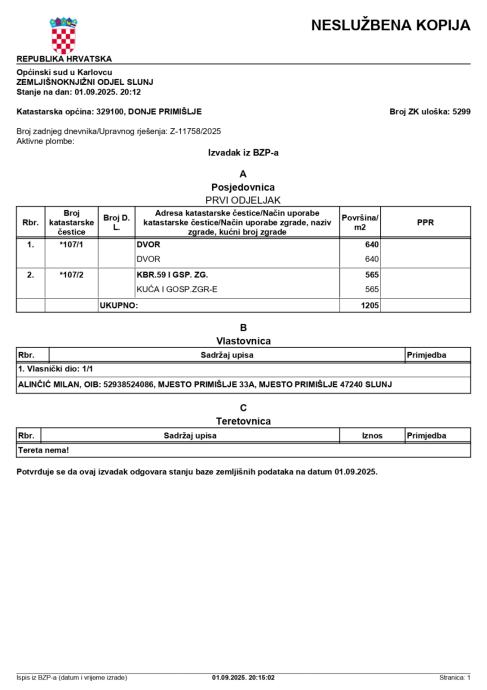 Posebna prednost: dio zemljišta uključuje i čestice **(107/1 i 107/2) na kojima su u zemljišnim knjigama upisani objekti (kuća i gospodarske zgrade). To daje kupcu mogućnost obnove, rekonstrukcije ili gradnje na postojećim građevinskim česticama.