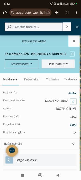 Katastarska čestica 11845 je uz cestu i ona je nepunih 500m2