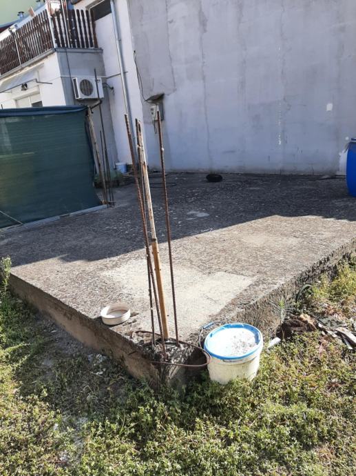 Na fotografiji se vidi betonska ploča koja je već izlivena na terenu, okružena postojećim zgradama u neposrednoj blizini. Na parceli su vidljivi armaturni šipovi, što upućuje na to da su pripremni radovi već djelomično započeti.