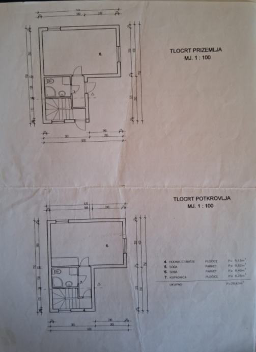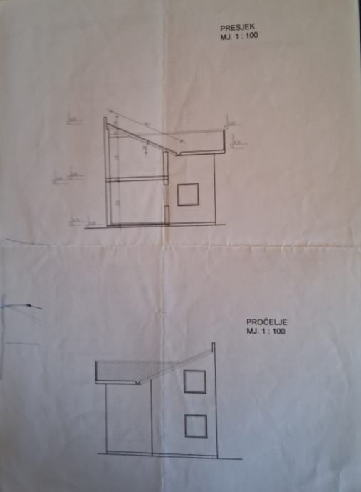 Prodaje se zemljište s nacrtima za izgradnju stambenog objekta. Iz dostavljene projektne dokumentacije vidljivo je da je planirana katnica s prizemlje i potkrovljem, uz kupaonicu i stepenište ucrtane u tlocrtu.