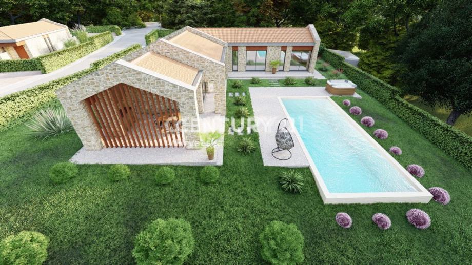Posredujemo u prodaji 4 građevinska zemljišta nedaleko Karojbe, u mirnom naselju, s projektima za izgradnju kuća za odmor s bazenom.