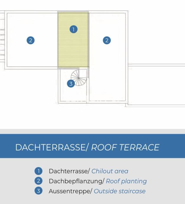 Prizemlje projekta sastoji se od ulaznog hodnika, kuhinje sa blagavaonom i dnevnim boravkom otvorenog tipa, kupaaonice, jedne spavaće sobe, vanjske ljetne kuhinje sa kaminom, sunčališta i bazena, te lift ali i unutarnje stepenište kojim se penjemo na 1.kat.