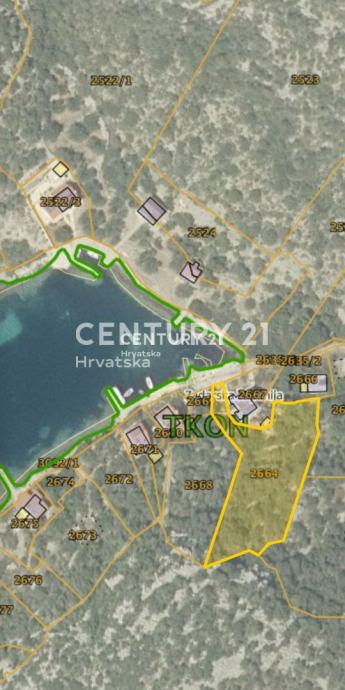 Tkon, Otok Pašman, Donje More, neposredno iznad morskog žala, u uvali Kruševica, na najboljoj lokaciji na cijelom Južnom Pašmanu, prodaje se zemljište 1911 m2 pravokutnog oblika, više nego prostrano za boravak u intimi posjeda.