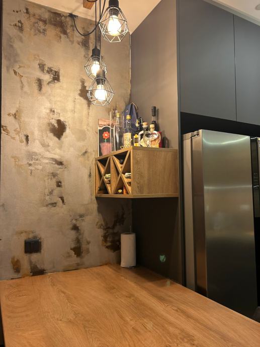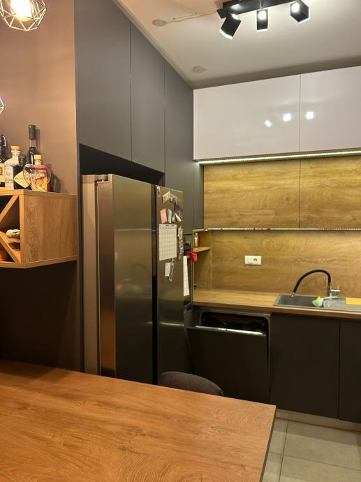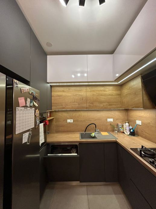 Stan je kompletno rađen po mjeri – od poda do stropa. Svaka prostorija uređena je unikatno kako bi se maksimalno iskoristio prostor, s naglaskom na funkcionalnost, estetiku i vrhunsku kvalitetu materijala.