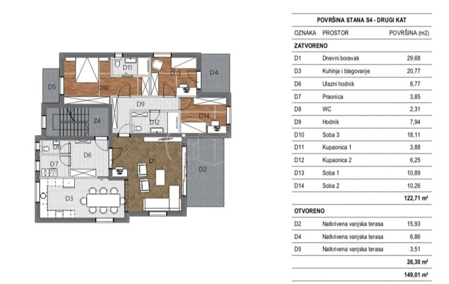 Stan obračunske površine 135,87m2 (neto korisne površine 149,01 m2).